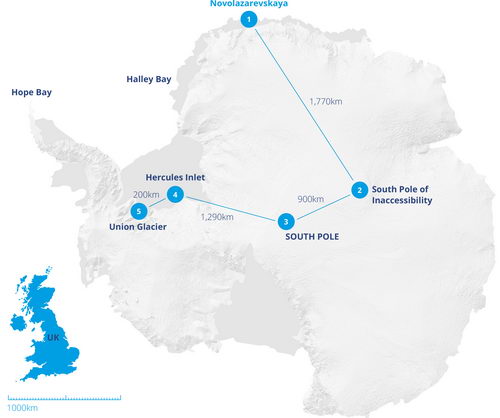 ستبدأ الرحلة الاستكشافية في نوفولازاريفسكايا، وهي محطة أبحاث روسية تقع في أرض الملكة مود التي تبعد مسافة 4,000 كيلومتراً جنوب كيب تاون. في المرحلة الأولى، يسافر الفريق لمسافة 770 كيلومتراً إلى قطب المحيط المتعذر الوصول إليه، ثم لمسافة 900 كيلومتراً إلى القطب الجنوبي الجغرافي، قبل أن يشقا طريقهما لمسافة 1,209 كيلومتراً أخرى إلى مدخل هرقل على الساحل المقابل قبل التوجه إلى نقطة النهاية في “يونيون جلاسير”. وسيواجه الفريق بعضاً من أسوأ الظروف التي من الممكن أن يتحملها جسم الإنسان، لا سيما وأنهما سيعيشان وسط أجواء يسودها نهار دائم على مدار 24 ساعة وبدرجة حرارة تبلغ -30 مئوية، والتي من الممكن أن تنخفض أكثر لتصل إلى -55 مئوية.
